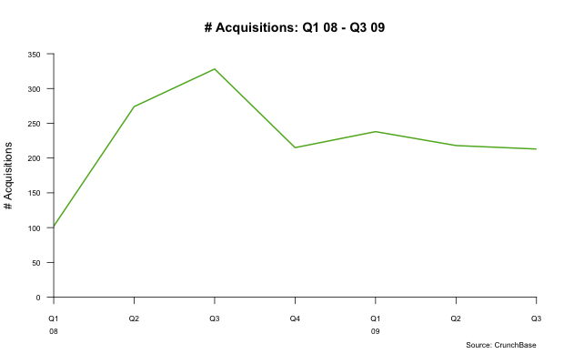 We ran some numbers on Crunchbase, which keeps track of all announced acquisitions, and in the third quarter $31.8 billion worth of acquisitions were announced, double the amount from the second quarter and up fourfold from the $7.6 billion low in the fourth quarter. That number was even up 23 percent from the year before. Update: Those original numbers were based on a preliminary run. We’ve since done a final run, and the the value of deals in the quarter were even higher: $45.1 billion (versus $15.4 billion in the second quarter).