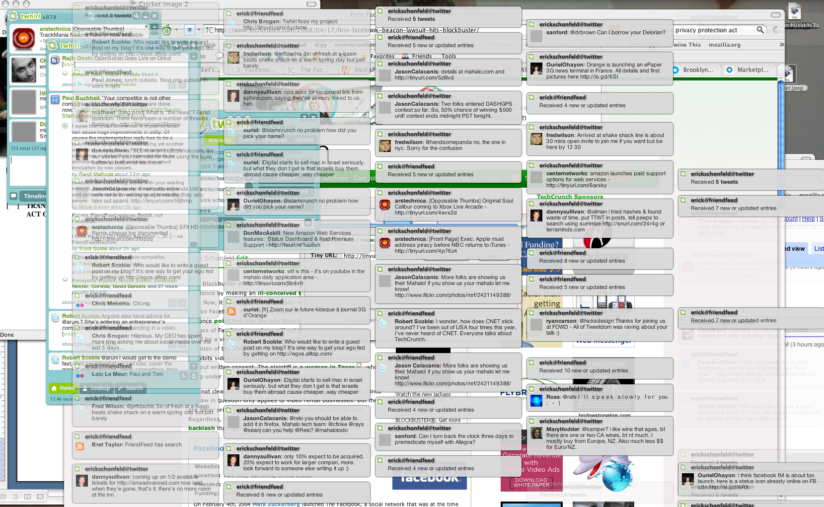 The image reminded me of another screenshot (see below, click to enlarge) that I once took of an earlier Twitter client called Twhirl, which Seesmic bought before developing its current product. About a year and a half ago, I complained that Twhirl took over my desktop when I first installed it with a constant stream of pop-up messages. I wrote in that post: