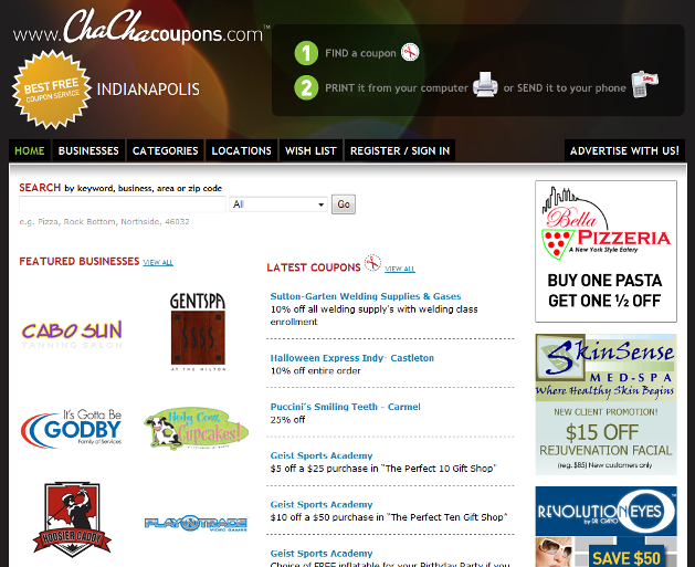 Anyway: ChaChaCoupons aims to make it easy for people to search for local companies and offers by business type, area of the city, alphabetical listing, newest deals, and more. Like most online coupon services, visitors can print coupons at their desktop or send them to their mobile phones to be redeemed at their favorite businesses. They can also send a coupon via text messaging to a ChaCha in-store coupon printer.