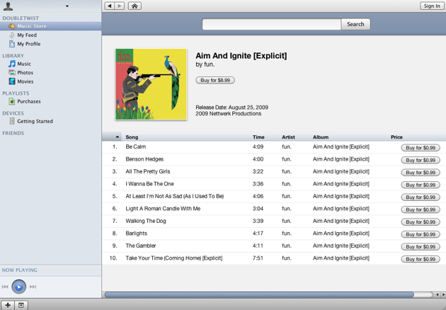 In fact, it’s probably safe to say that the new doubleTwist music store is actually easier to use to download music than iTunes is, simply because there’s so much less going on. Upon launching the store you’ll see a handful of top albums and songs, along with a prominent search box at the top of the screen. Click on an album and you’ll see a list of the disc’s tracks, which you can click for a 30 second preview. To buy something simply enter your Amazon ID.