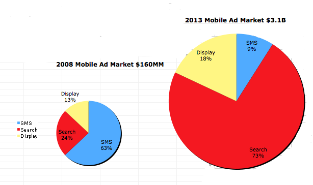 Display ads are projected to go from 13 percent of the total to 18 percent, while SMS ads will decline as a percentage from 63 percent to 9 percent (see charts). So once again it looks like search is going to be the big winner. No wonder Google is so focused on mobile search as one of its major sources of growth.