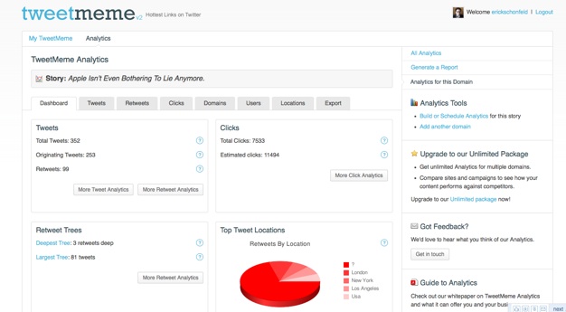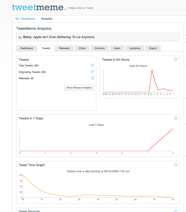 Social media experts are going to love this because it will give them something to do and maybe charge their clients extra for, which is why Tweetmeme is charging for access to the Analytics. After a one-month free trial, Analytics will cost $50 per month per domain or $500 per month for an unlimited number of domains. Thus, Tweetmeme joins startups like bit.ly in the belief that there is money to be made in all of this Twitter data.