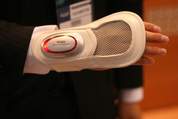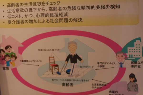 One of the more interesting booths at CEATEC is that of the Tagged World Project (more in Japanese here). It aims to deploy many RFID tags around an elderly person’s domicile, and then equip their slippers (or other house clothes) with RFID readers that will read the tags in its proximity. Then a variety of analyses can be performed on the data collected to determine, ostensibly, how healthy and active an older person is.