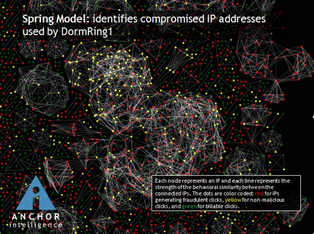 Click fraud occurs when someone sets up a website, signs up with an ad network, and then clicks on the ads to generate ad revenues with false clicks. DormRing1 operated the same way, except it easily involved more than 1,000 people who set up more than 10,000 Websites to spread out the fraud. The image above depicts a portion of the ring, with each red dot representing a source of fraudulent clicks with similar digital signatures. (Anchor monitors such activity on behalf of advertising clients).