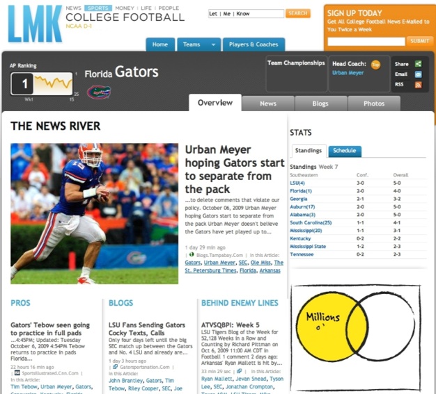 But LMK will also have specially curated pages which will have its own freelance editor and designers. The first enhanced topic page it will be launching is for U.S. college football. Bob Roe, a former assistant managing editor at Sports Illustrated, is the sports expert who will be overseeing the sports pages. Once the best sources for stories about each team, player, and coach are selected from both major news sites to fan blogs, Evri’s technology does the rest.