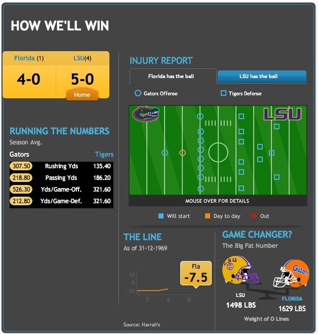 Whenever there is game against another team, LMK will also show the most authoritative news sources for that team in a “behind Enemy Lines” column. Each page will also show stats, photo galleries, and interactive data modules which illustrate information such as which starting players have injuries. Just mouse over their position, and you can see if they are scheduled to play and what injuries they have. Or check out the “big fat number,” which compares the total weight of each team’s offensive line.