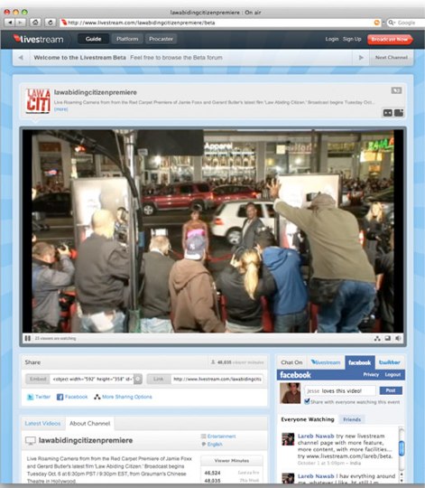 Livestream has also made its players a whole lot more social, by letting users discuss live video in realtime with a new player side chat companion. Users can discuss live videos using Facebook, Twitter or Livestream’s in-house chat application. Livestream’s chat widget has separate tabs for for Facebook and Twitter streams, where users can update their status or send Tweets from the box. Users can also now share videos to Twitter, Facebook, MySpace, Digg and Delicious.