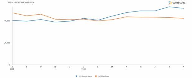 MapQuest is seeking to engage the developer community more deeply as the company battles with Google for web and mobile map domination. According to Hitwise, Google Maps passed MapQuest in visits earlier this year. ComScore shows that Google Maps surpassed Mapquest last January, and by August, 2009, Google Maps had 51.3 million unique visitors, compared to 42.2 million for MapQuest.