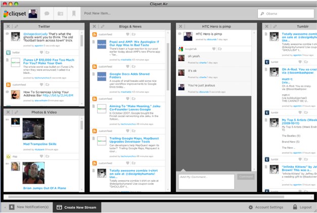 My only complaint about Cliqset’s desktop app is that it is powered by Adobe Air, which tends to be buggy and slow my computer down. But for those of you who dislike Adobe Air as much as I do, there’s always the web-based platform. In September, Darren Bounds, president of Cliqset, told us that the platform aims to be a less clunky version of FriendFeed, with a target audience of users who aren’t as technologically savvy. And Cliqset plans on launching and iPhone app and an Andoird app in the near future.