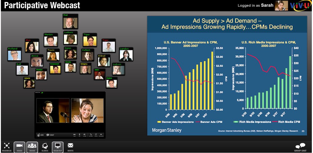 ViVu’s “video as a service” lets anyone create a live video webcast that can be used for online meetings and events, sales presentations, demos or training sessions. ViVu’s cloud-based technology can be enabled via a PC, Mac or smartphone and provides an auditorium like-view within the browser (see above) making it ideal for large conferences.