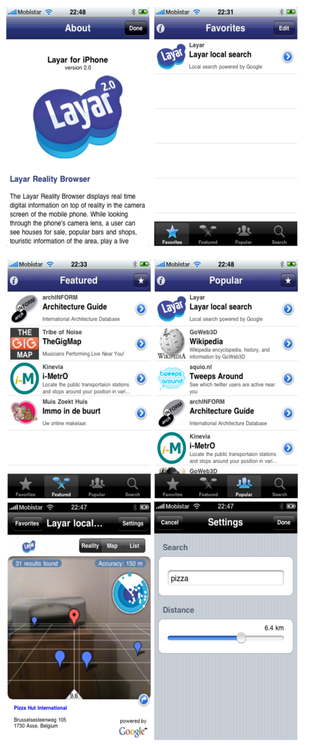 Layar does all that, and does it well. I used the iPhone application – which is entirely free, by the way – to find pizza places here in the Brussels region, and I was able to locate dozens of places where I could get one simply by rotating the camera around my house. If you want, you can filter the distance in between 1 and 10 kilometers to narrow your search down.