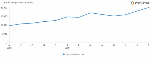 LinkedIn has hit 50 million users, according to a blog post today, growing from 45 million users two months ago. And according to the latest comScore data, LinkedIn is steadily growing in terms of unique visitors. For September, LinkedIn had 9 million unique visitors in the U.S. compared to 8.7 million unique visitors in August. But it appears that LinkedIn’s growth is mainly attributed to a burgeoning international user base. Worldwide, LinkedIn grew from 18 million unique visitors in July to 20 million unique visitors in August.