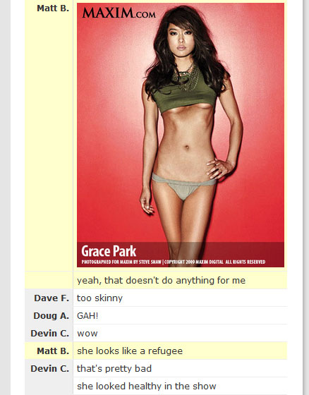 Battlestar Galactica nerds, Maxim is counting on you to buy its latest mag. Photoshopped and chopped versions of Tricia Helfer and Grace Park are gracing the November cover. But thanks to the wonderful Internet, there’s no need to fork over hard-earned money just to check out the rest of the photo set. Maxim.com has a bunch primed for your viewing pleasure. But be warned, the pics might kill any fantasies you currently have about Number Six or Boomer.