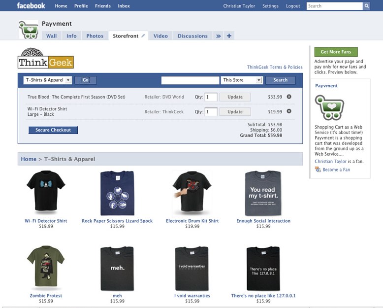 Once the shop is set up, potential buyers can interact with the storefront like they would a -commerce site. You can add desired products to your cart and remove them easily. Payvment also lets buyers conduct searches within the store. When a user adds a product to their shopping cart on Facebook and clicks to follow-through on buying the product, Payvment takes the user to a separate page outside of Facebook, where the user can use PayPal to buy the object. Payvment’s CEO and founder, Christian Taylor, tells me that it is necessary to conduct the transaction on a separate site because Facebook doesn’t yet offer e-commerce security options. And any purchases made will not be made pubic to your friends.