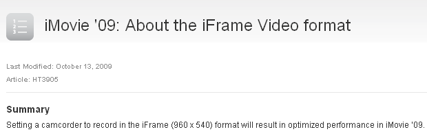 iFrame, and we can talk about the name in another post, sets in stone a size of video which has no place in this world. The idea is that it keeps the format homogenous from camera to editor. Really? Because that’s what all regular video editors do already. The only reason iMovie needs a special format is because of the limitations Apple placed on it. The size and workflow differences between iFrame and 720p are really not very significant. What’s my objection, then? I’ll tell you. Apple is ignoring the galaxy of products out there that already support a perfectly good format. Can you think of a single device, display, web page, or anything that has a 960×540 resolution?