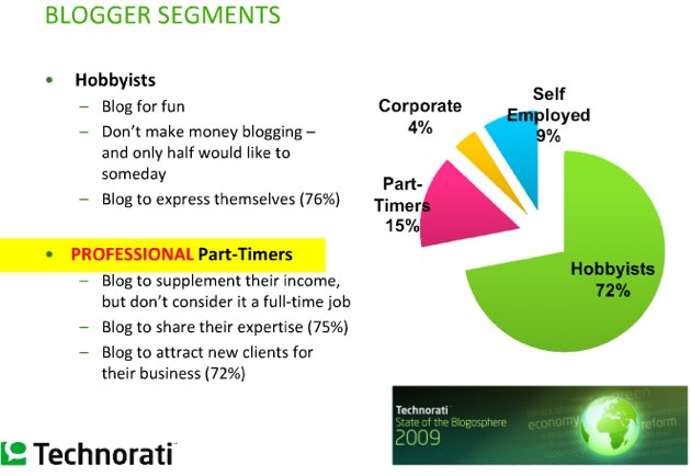 72% of bloggers are hobbyists, says Jalichandra, and blog for fun. They don’t make any income from blogging, and only half hope to someday. They blog simply to express themselves. Of professional bloggers, only 10% blog 40 or more hours per week.