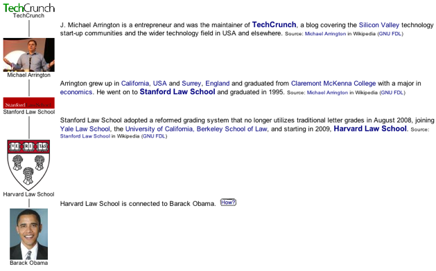 If you’re a fan of the classic game ‘Six Degrees of Kevin Bacon‘, you’ll love the Cruxlux engine. The company has built algorithms that will automatically figure out how various people, places, things, and topics are related through a handful of steps, using sources across the web. Say, for example, I wanted to see how TechCrunch is connected to President Obama: the site first says that TechCrunch was founded by Michael Arrington, who is connected to Stanford Law School (he went there). That in turn is connected to Harvard Law School (they both use non-letter grading systems). Which brings us to Harvard Law School, which Barack Obama attended. With each step, the site has a ‘how’ feature that tells you how the subjects are related.