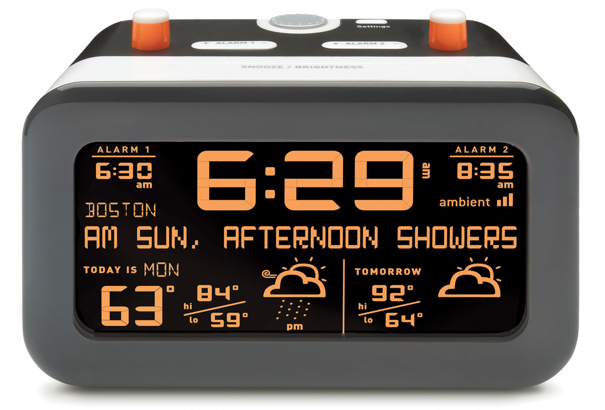 You know the Chumby, right? It’s that bedside clock/alarm/radio/YouTube & Flickr open source thingamabob. It’s hella cool, but it’s also kind of complicated for the non-techy and requires WiFi to work. I say blah to that! Really the only extra info you need to know in the morning besides the time is the weather anyway. That’s where the Flurry Alarm Clock from Ambient Devices comes in.