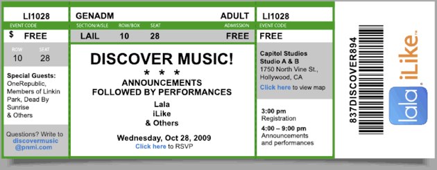 Press, including us, received an invitation this morning (see ticket image above) inviting them to a Hollywood event next week hosted by music services Lala and iLike. The invitation, titled “Discover Music!” says announcements will be followed by performances, and that Lala, iLike “& Others” are hosting. The “& Others” includes Google, we’ve heard from multiple sources, and the new service will be unveiled. All four major music services are backing the service.
