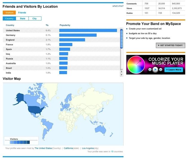 Until now, artists with a presence on MySpace could only view aggregate numbers for profile views, friends, total song plays and songs played today. Tonight, though, they’ll launch an artist dashboard with significantly more analytics data. Artists can view their fans by age and location demographics, and see total plays, friends and profile views over time. The dashboard is available in 17 languages. And it also includes similar information for the artist from iLike, which MySpace acquired earlier this year.