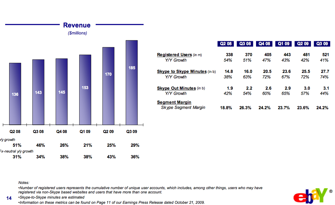 Skype’s registered users grew 41 percent to 521 million people. That’s a stunning 40 million new registered users in the past three months. Revenues grew 29 percent to $185 million. Free Skype-to-Skype minutes grew 74 percent to 27.7 billion minutes, whereas SkypeOut minutes (which is what members pay for) grew 44 percent to 3.1 billion minutes.