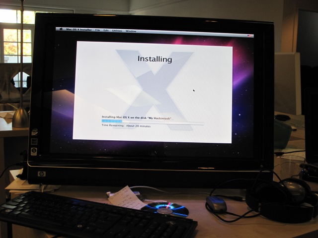 It’s been a few hours since the Internet exploded over the Psystar Rebel_EFI bootloader and we tried it out on a few machines in the office and originally thought it failed. However, I let the boot screen run for a bit without touching the keyboard on an HP TouchSmart we had here and it suddenly dropped into the OS X install screen. A quick format using Disk Utility and I was, amazingly, in business. The touchscreen even worked!