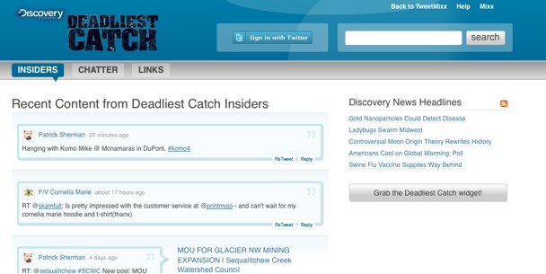 Channels also include a “Chatter” tab that uses a list of search terms relevant to a company or brand to find both tweets and links that contain those terms; a “Links” tab that displays the hyperlinks containing matches to the list of search terms; and a widget to share and link to a brand’s site, blog, Facebook or MySpace page and more. Currently, TweetMixx has branded channels for PC Mag, the Discovery Channel’s Deadliest Catch, Duke University Basketball and others.
