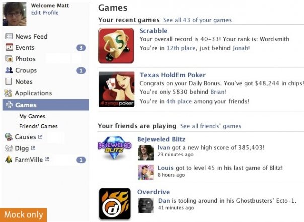 Applications, however, will be easier to access. An “Applications” link will appear in the left-hand navigation column. Clicking on that will show you all of your Facebook apps. And in a sign that shows the growing importance of social games in Facebook, “Games” will get their own link in the left-hand dashboard, even though they are a kind of app. Games are special that way.