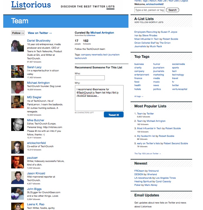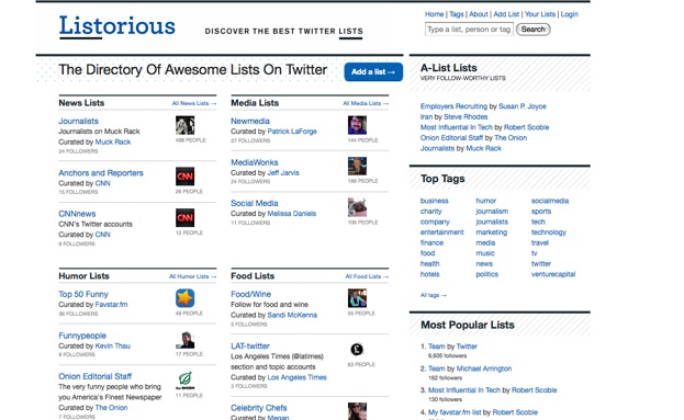 But how do you find the best lists? Already, there is an independent directory service which is launching in tandem with Twitter Lists called Listorious. (Warning: it only fully works for people who have Twitter Lists enabled). Listorious offers a curated collection of lists across various categories such as media, humor, marketing, finance, and food. You can see the most popular lists, ranked by how many people follow them. It is also possible to search by tags, or just search lists in general.