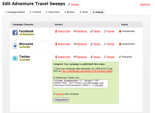 Wildfire also tries to streamline the process for the company running the campaign. The platform uses a wizard to set up the sweepstakes microsite, which companies can then customize with their rules, opt-in newsletters, and the appearance. Companies can also prompt entrants to their sweepstakes to start following their official Twitter accounts, which makes it easy for them to build up a larger audience. On the backend, Wildfire allows clients to control their campaigns across all supported platforms (Facebook, the web, and Twitter), and also offers detailed analytics for each.