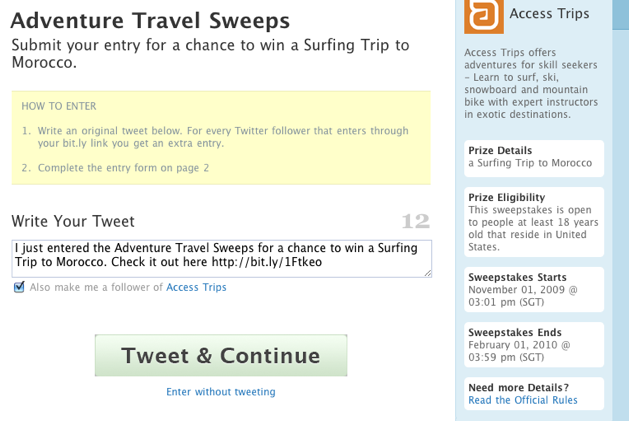 If you’ve been on Twitter for a while, there’s a good chance you’ve come across a tweet that asked you to retweet something (usually a link to a spammy-looking site) for the chance to enter a contest. Of course, these are typically bogus, leading many people to simply ignore them. And that poses a problem to the companies who really are trying to run sweepstakes on Twitter, who can have a hard time proving their legitimacy. Wildfire, a platform for building viral marketing campaigns, is looking to help: the company has just launched support for sweepstakes on Twitter, allowing brands to now manage campaigns across their websites, Facebook, and Twitter simultaneously.