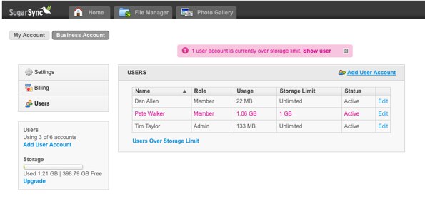SugarSync for Business, which is specifically designed for small businesses, lets enterprise users sync data across computers and smartphones syncing capabilities, share folders and collaborate with employees within its platform. The version allows administrators to create account for many users, where employees share the storage amount, but each employee has a separate user account (the employee’s data is not shared with other employees). Admins can set storage limits for each user and also receives alerts when user is near limit. And it’s easy to delete a user account without losing the data that’s in the account.