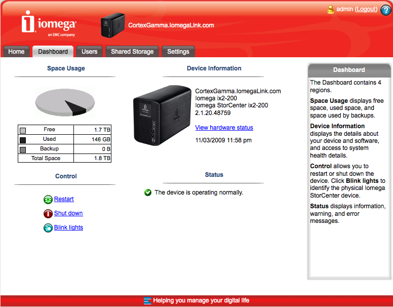 The Hardware: First off, this thing feels like it could survive being run over by a tank. And if tanks can’t destroy your data, what do you have to fear? Inside the metal enclosure is a 1.0 GHz Marvel processor, 256MB of RAM, and two SATA II platters. The disks are set up in a RAID 1 mirror, although you can disable the RAID and run it as JBOD instead. All of this is controlled by a Linux OS, EMC LifeLine. You also have three USB 2.0 ports, one in front, two in the back. Gigabit Ethernet jack, power input, and one of those nifty security lock ports if you have problems with people walking off with your hard drives.