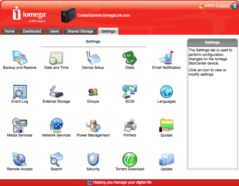 Getting Connected: The setup for this thing was a breeze. Plug in power, plug into router, run install disc and you’re ready to start storing data like its going out of style. Instead of having to install some sort of UI software, you’ll be greeted with the above page in your web browser. From this control interface you can have full administrator access from any machine on your network. You can see the list of various settings below. I’ll go through and hit the big stuff.