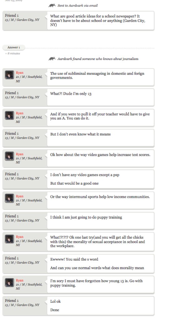 This is, apparently, not a fake exchange. A young journalist comes to Aardvark user Ryan Asava for help. Things go downhill from there. If you never quite understood the service, you’ll get it now. Our previous coverage of the company is here. Thanks Marshall.