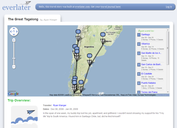 Everlater is a place where you can basically record your travel experiences, share them with others, and discover new travel ideas from your social graph and other travelers that match your profile. The goal of the service is to centralize all travel conversations and information sharing into a single place.