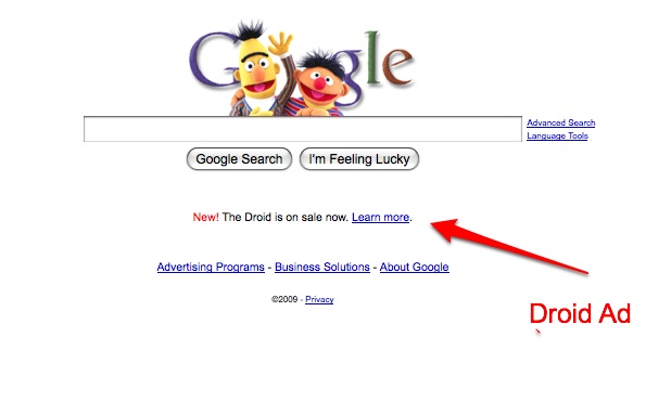 Do you see something strange in this screenshot of Google’s homepage today? No, not Bert and Ernie (it’s Sesame Street’s 40th birthday). It’s that ad for the Verizon Droid right there under the search box (today is also Droid Day). Although, the juxtaposition does make it seem like Bert and Ernie are trying to get you to buy a Droid.