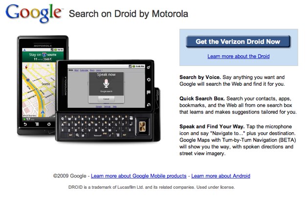 But the company does make exceptions now and then to promote a partner’s product, such as it did with Firefox back in the day, and with the launches of Chrome and the very first Android phone from T-Mobile a year ago. And at least this Droid ad does not break the 28-word rule. The page weighs in at 27 words.