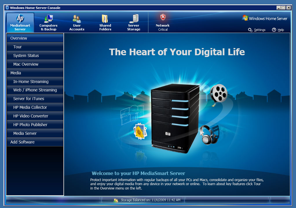 Instead of the stark WHS setup screen, new users can use HP’s software pack that guides them through setting up remote backups, assigning permissions to users, and finding media spread out over a network. It still has the same media collecting, iPhone-streaming and transcoding software in previous models, but the Media Collector works a lot better on Macs now.