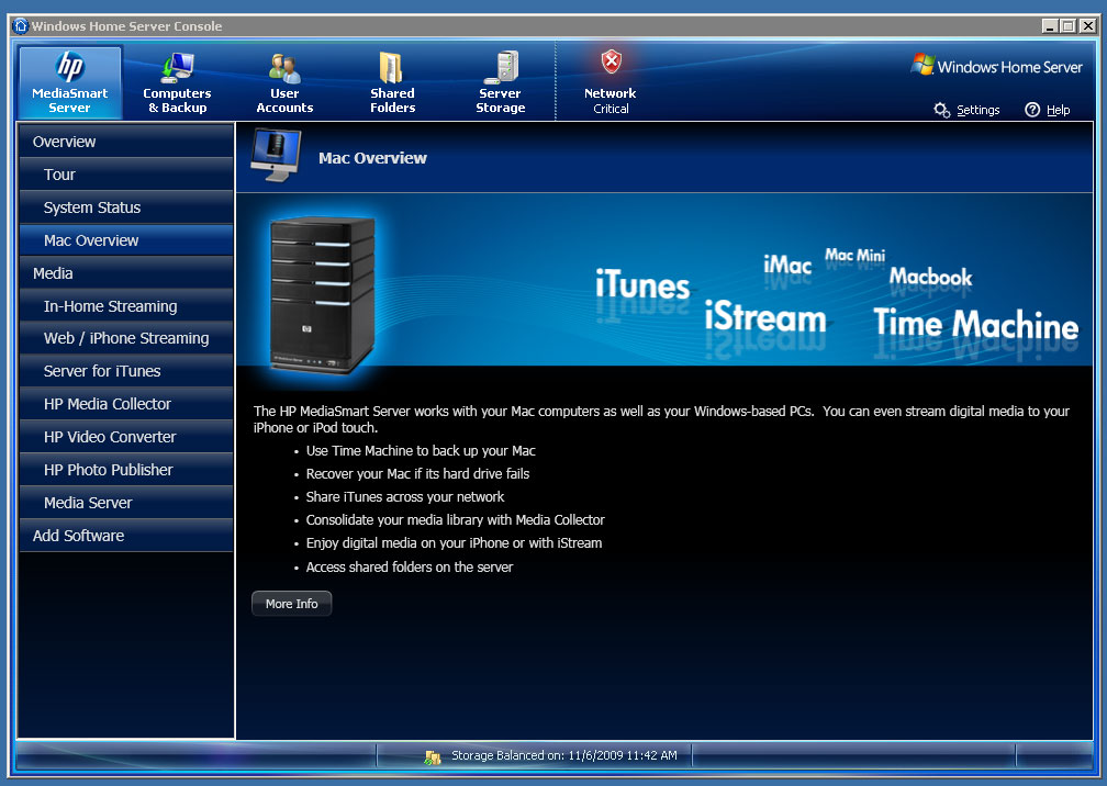 Plus, the server now ships with a OS X WHS management tool. It’s essentially a repacked remote desktop client, but it gets the job done. Because of these updates, an HP MediaSmart server can live comfortably on an all-Mac network.