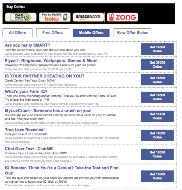 There’s an image at the bottom of the post showing just the mobile offers that were up on Zynga’s games until earlier today when we asked them about this. All of these violate Facebook’s existing terms, and any normal human being would consider them scams. And none of these should be there given Zynga’s promise to take down all mobile offers.