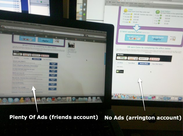 They weren’t taken down though. Or rather, they were, but just for me. Other users were still seeing the same mobile ads. And the filtering was clearly directed at me, since I logged in on the same IP address with a friends account and saw the ads. I held a laptop showing the ads up next to my screen that didn’t show the ads and took a picture:
