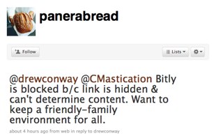 Here’s an interesting factoid. Panera Bread, the national bakery and cafe chain, has blocked all Bit.ly links from users who happen to be using Panera’s free WiFi. In a tweet to user who was inquiring about the issue, Panera’s official Twitter handle responded that the coffee shops have “blocked b/c link is hidden & can’t determine content. Want to keep a friendly-family environment for all.” Hmm.