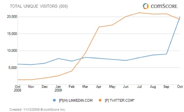 Did LinkedIn more than double its U.S. visitors in October? A casual glance at the latest comScore data makes it look that way, with LinkedIn shooting up to 20 million unique visitors in October, 2009, from 9 million in September, 2009. The new estimate puts LinkedIn ahead of Twitter, which saw a decline of U.S visitors last month to 19.2 million.