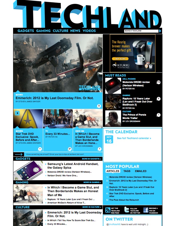 Time Inc just launched a new technology blog called Techland, headed up by one of our former CrunchGear editors Peter Ha. Time magazine’s senior tech writer Lev Grossman is also a contributor. Techland covers the intersection of gadgets and geek culture, and is aimed at a mainstream audience.