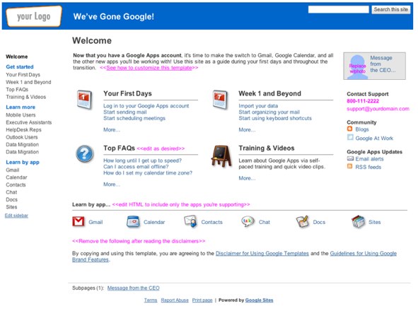 Google Sites now has a fully stocked gallery of public templates that can be used by both consumers and businesses. Google has also created templates that are targeted for business use. Templates let you quickly start a new site with pre-built content, embedded gadgets, page payouts, navigation links, theming and more. And Businesses using Google Apps will also have a private area where employees can share proprietary site templates, which can be made via Sites’ recently launched API, with coworkers. This is actually useful to organizations, such as the Boy Scouts of America, which wants to share templates for chapters over the nation to launch as their platform.