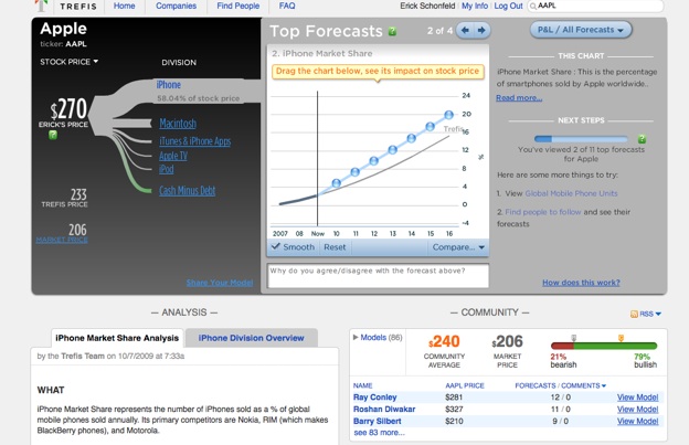 Started by three engineers and math whizzes from MIT and Cornell (Manish Jhunjhunwala, Adam Donovan, and Cem Ozkaynak) who did time at McKinsey and UBS bank, Trefis breaks down a stock price by the contribution of a company’s major products and businesses. For instance, 51.3 percent of Apple’s stock price is attributed to the iPhone, 25.5 percent to the Macintosh, and only 7.7 percent to iTunes and iPhone apps. Don’t agree? You can change the underlying assumptions by simply dragging lines on charts forecasting the future price of the iPhone, its market share going out to 2016, and so forth. Every time you change an assumption, the price target changes accordingly.