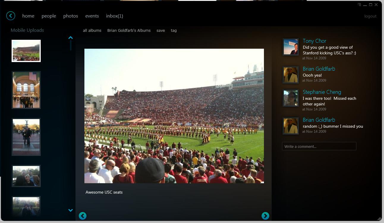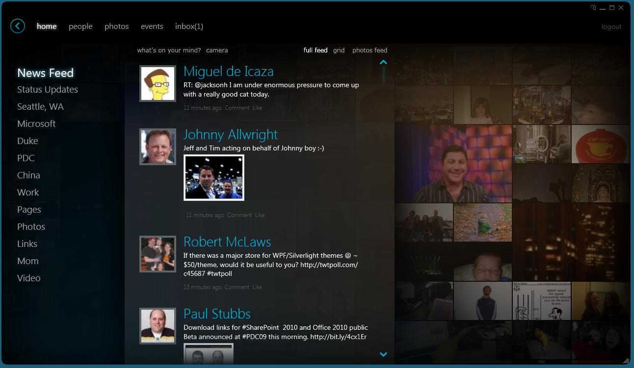 Some screenshots below of what Facebook would look like as a Silverlight app. They show a reskinned stream view, a people view, Facebook photos, and a grid view.