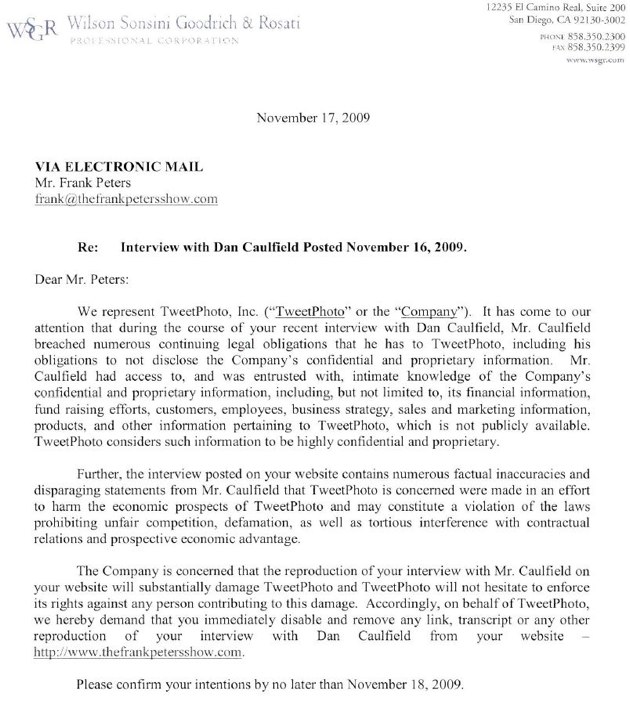 “The interview posted on your website contains numerous factual inaccuracies and disparaging statements from Mr. Caulfield that TweetPhoto is concerned were made in an effort to harm the economic prospects of TweetPhoto and may constitute a violation of the laws prohibiting unfair competition, defamation, as well as tortious interference with contractual relations and prospective economic advantage,” the letter says.
