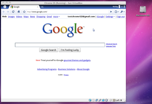 First, a few caveats: we didn’t create the Chrome OS build ourselves — it was downloaded from BitTorrent. In theory it could possibly have been tweaked by some malicious hacker to steal your Google account information (this is unlikely, but who knows). There’s an easy fix if you’re worried though: just go make a throwaway Gmail account, and use that to play around with the OS. Also note that because this is running in a virtual machine, you’re probably not going to be seeing great performance (like that 7 second boot time). But it’s more than good enough to get a feel for the OS for yourself.